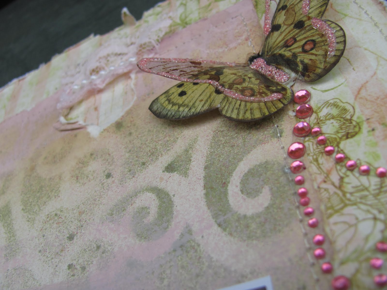 I used a few different materials on this piece, I braided some raw canvas, and did the letters in chipboard covered in dictionary text. I also used a piece of material that you use to hem with - it is called fusible web - it was really neat to work with, as it will stick to whatever you have it touching when you apply heat - which I did with my heat gun. One of my Cabbage Roses, this time made out of a page from a hymn book and sprayed with Glimmer Mist. I also used some Staz On ink on acetate to make some 3D butterflies.